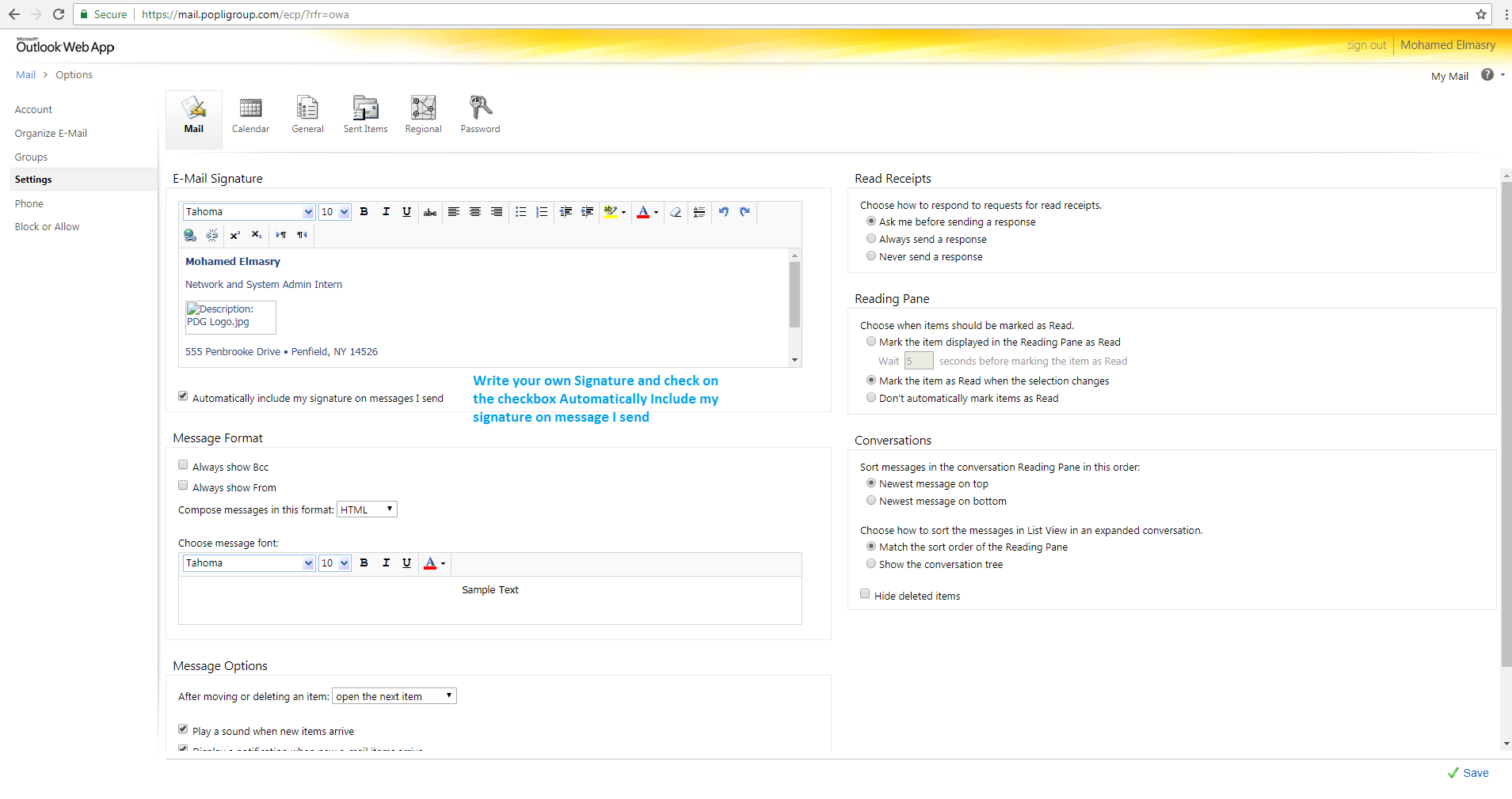 This document describes the creation of E-mail Signature on Outlook Web App for Popli Design Group. Each employee in Popli Design Group in a need to create E-mail Signature on Outlook Web App should follow the following steps.