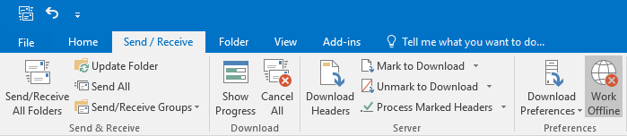 To get out of offline mode, click on the Send / Receive tab. Then click the Work Offline button.